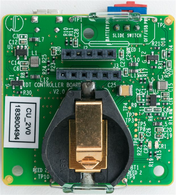 The board is marked IDT CONTROLLER BOARD V2.0. It appears the USB power enters through the microUSB connector where it is filtered and smoothed by L7/C12 before being regulated by U1 which appears to be a Texas Instruments TPS6220x high-efficiency SOT23 Step-Down DC-to-DC converter. Another regulator based on the same converter can be seen at U3, which perhaps may be responsible for the two CR2032 coin cell supply in the “stacked” battery holder that has somewhat dirty looking solder joints. A smattering of other support components and test-points are present on the board as well. There are two magnetic reed switches – one on the top and bottom which are used to put the module into reset/always-on modes.