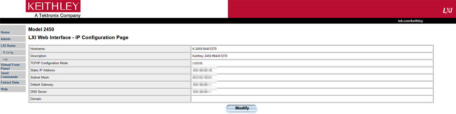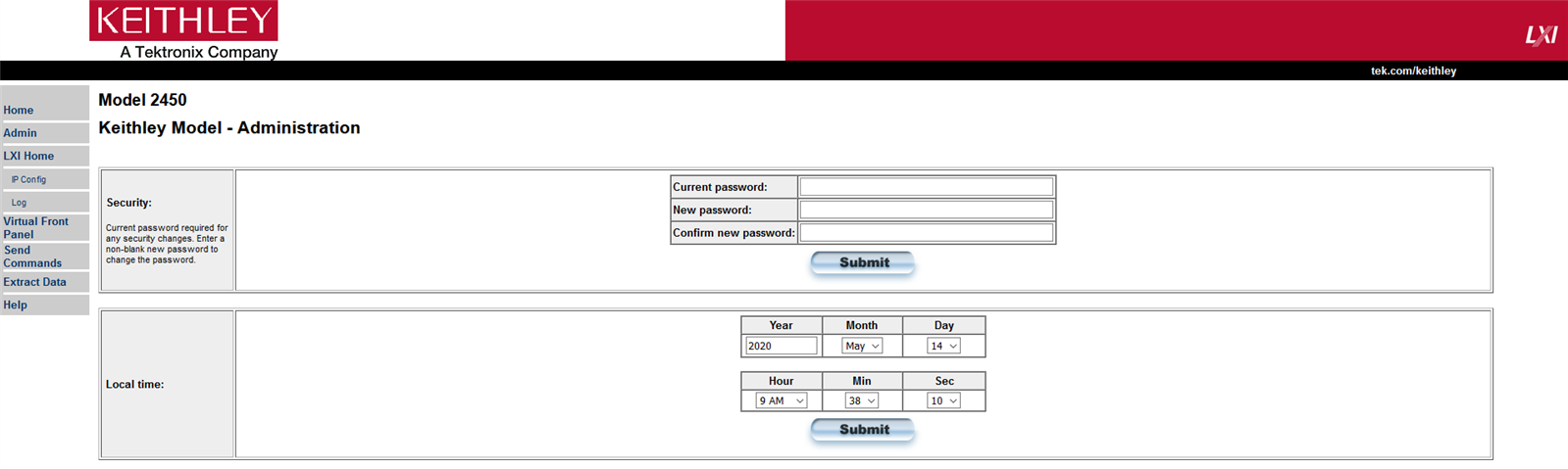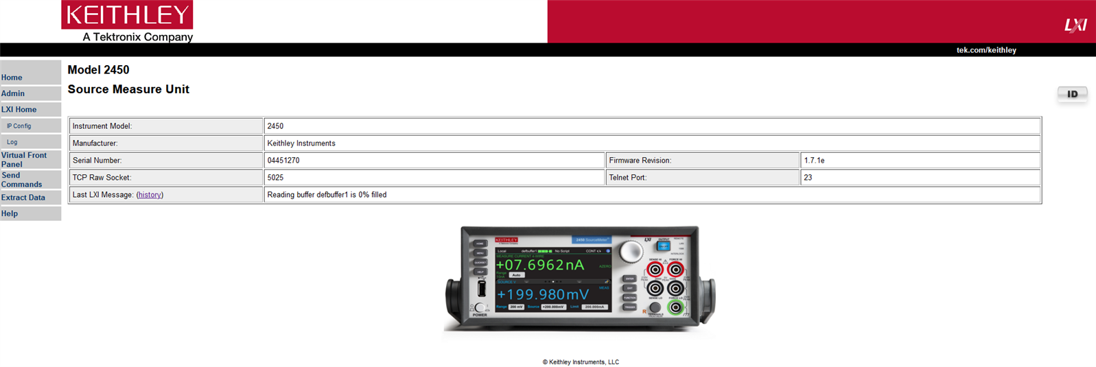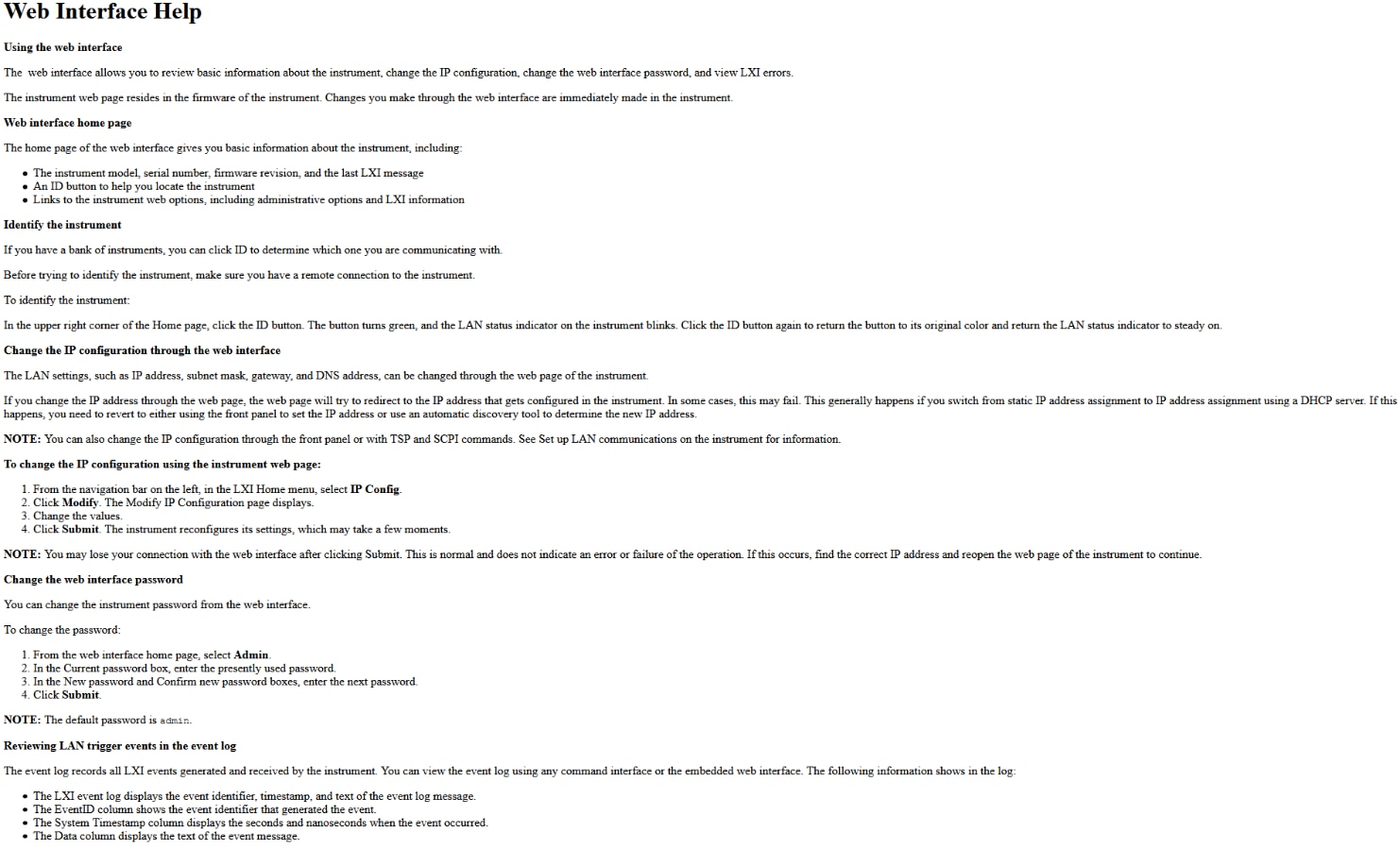 The homepage provides a simple summary of the instrument’s details and last LXI message. From this page, a number of options are provided along the sidebar navigation.