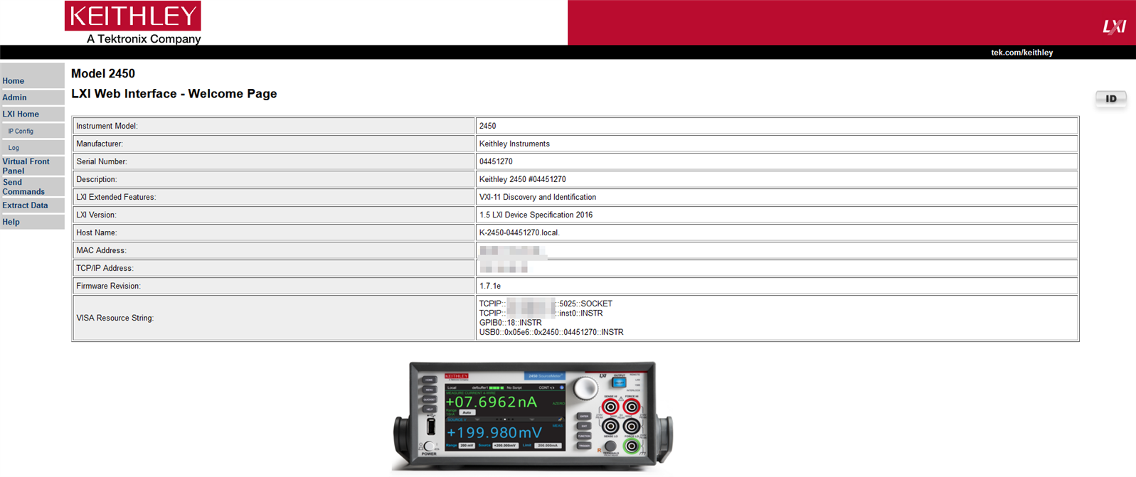 The LXI page offers a quick rundown of the instrument’s details including model, manufacturer, serial, description, LXI version/features, hostname, address, firmware and VISA resource strings. An ID button is also provided to make it easy to identify the instrument in a rack.