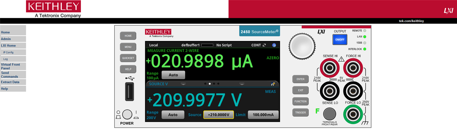 The Keithley 2450 SMU offers a vast array of remote-control connectivity options, including USB, LAN, GPIB, TSP-Link and Digital I/O. The USB interface allows for front-panel usage of USB Mass Storage Devices in FAT/FAT32 format for recording data, settings and screenshots from the instrument and for loading scripts and firmware upgrades. The rear USB interface allows for use as a USB-TMC compliant instrument. The instrument’s LAN interface is compliant with LXI Version 1.5 (2016) as of the latest firmware upgrade, offering a powerful web interface, direct socket and VXI-11 connectivity. The web interface is especially commendable for its implementation of the virtual front panel and buffer download capabilities which makes remote working with the instrument without programming a breeze. The unit offers GPIB connectivity to ensure near-drop-in backwards compatibility with older SMUs with a minimal amount of programming changes while offering an industry-standard bus with hardware trigger synchronisation. Alternatively, the Keithley-specific TSP-Link daisy-chain bus is also supported, along with TriggerLink using an adapter with the digital I/O port. The digital I/O port offers six I/O lines, configurable as input, output or open collector for use as digital bits or trigger, and additionally a Vext line for use with relays, making it a very versatile arrangement for interfacing with both Keithley and non-Keithley equipment.