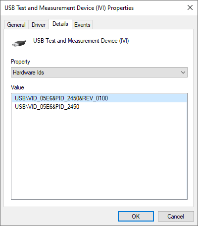 The Keithley 2450 identifies with a VID of 05E6, PID of 2450 and REV of 0100.