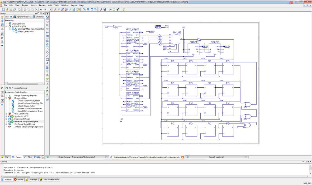 I decided I would design with simplicity in mind. Not being a highly skilled FPGA designer, I opted to draw it in Schematic Capture, not paying too much attention as to signal routing and stuffing whatever was necessary in the .ucf file to ignore my clock-routing transgressions in my desperation to use all four DCMs available to me to generate 400, 333, 300 and 266Mhz clocks from the onboard 100Mhz reference. This was switched through a 4:1 mux to drive two cascaded 8-bit counters (JA/JB ports) and a 16-bit LFSR (JC/JD ports) at that clock rate.