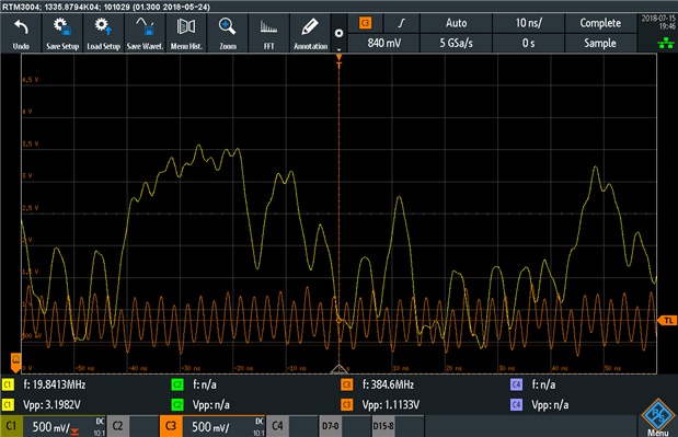 Unfortunately, as it turns out, I was being too optimistic (and I knew it). Trying to get such high clock rate signals out of ports/pins which are not impedance matched or otherwise designed for it, along with spaghetti wiring and poor grounding practices made the signal either evaporate or look like mush. The orange is the 400Mhz clock (roughly) and the yellow is the LFSR output (which is practically no longer digital as far as I’m concerned).