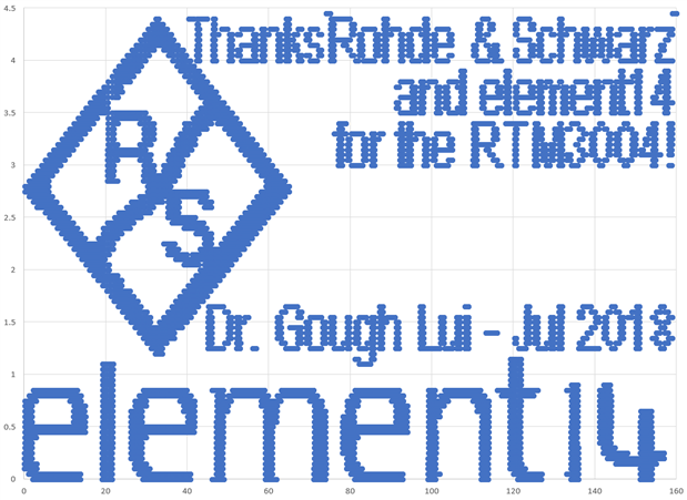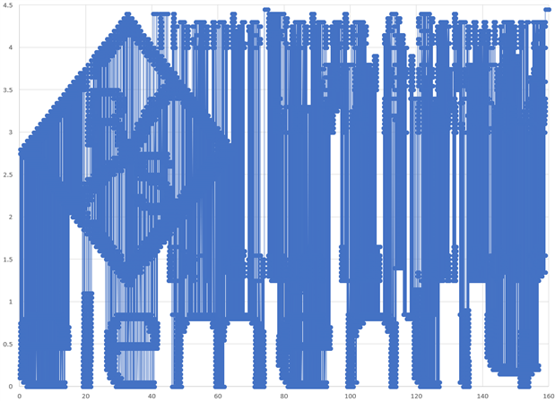 To begin, you need to decide on the rough aspect ratio of the image (approximately 16:9) and the number of data points your AWG has. For every dot drawn in each column, we have to “wait” in that location (a voltage level) – a dwell time of at least two samples is needed so that the oscilloscope can “distinguish” a “blank” area where the sample is being changed from a drawn dot. In this case, for 32,000 points, something like 160x90 seemed sensible as it provided 14,400 pixels and if each was black, then you would need 28,800 data points. In the case a column actually had no lit pixels, the time still needed to be passed, so I selected the top voltage value as the “dummy” fill.