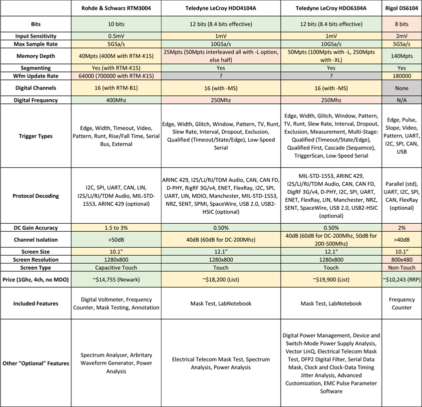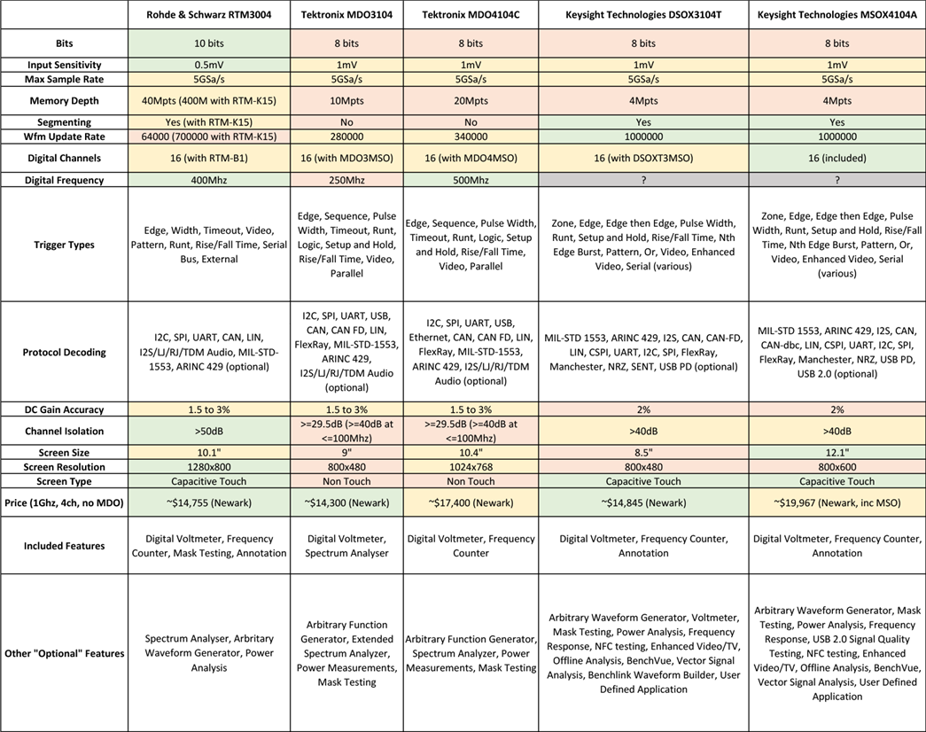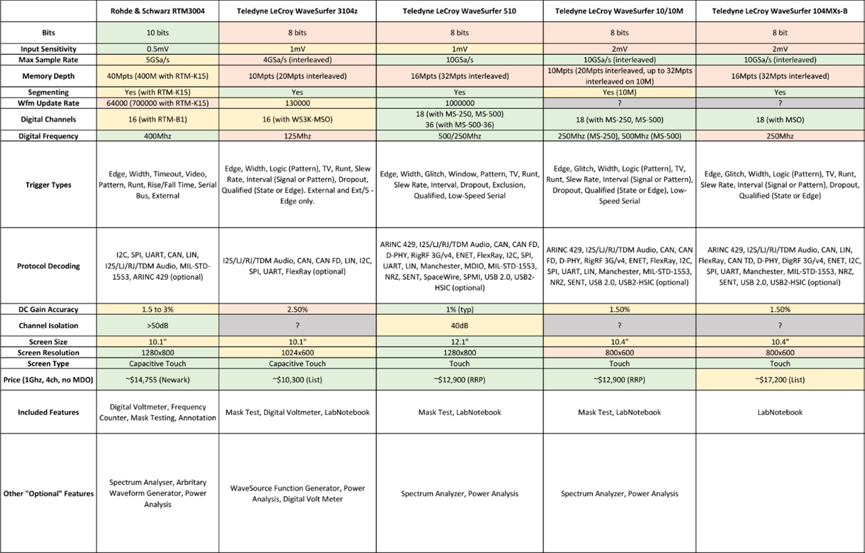 As a result, I spent some time looking around the major suppliers (including Rohde & Schwarz, Tektronix, Keysight, Teledyne LeCroy and Rigol) to see what was on offer. The criteria that needed to be met was a four-channel unit with 1Ghz bandwidth (upgradeable or base) as a minimum. The majority of the units compared also offered mixed-signal oscilloscope (MSO) features either as an option or included in their base configuration. A few key criteria were compared in a table, colour-coded to “group” attributes into different levels of performance.