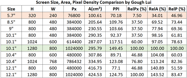 While performing the comparison, I noted that there was a significant discrepancy in both size and resolution of the screens of the candidate units. Seeing as the screen is primary form of interface for someone using the unit interactively, having a good screen is of great importance. As a result, I compiled a table of sizes and resolutions and computed the total number of pixels, screen area and pixels-per-inch (PPI) density of the screen to better understand the relative sizes of screen and their sharpness.