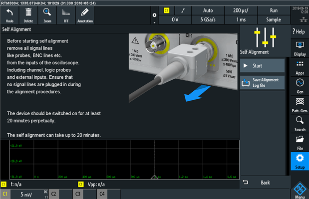 Finally, before doing any serious work, it’s always a good idea to do a self-alignment procedure to ensure all the channels have their gain, offset, skew, etc compensated as best as possible. The self-alignment “app” reminds you to remove all inputs and takes about 13 minutes to complete.
