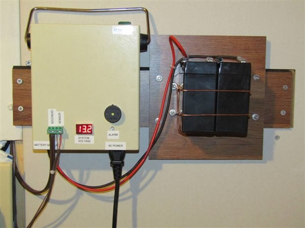 This is a picture of the completed unit mounted with its battery pack on the wall alongside the mechanical mechanism that closes the water valve.