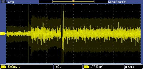 For comparison, here's a switching supply (Maplin N93CX). This has an output switch. You can see just before the mains goes on it gets slightly quieter - that's my hand moving close to the case. The PSU output control might be electronic - the switch doesn't maintain its state (it always starts up in the off state) and I can't hear a relay clicking. With this supply, the circuitry is definitely contributing to the output noise.