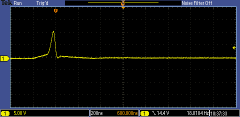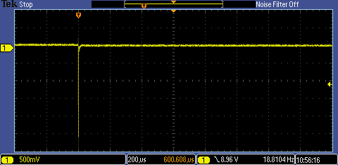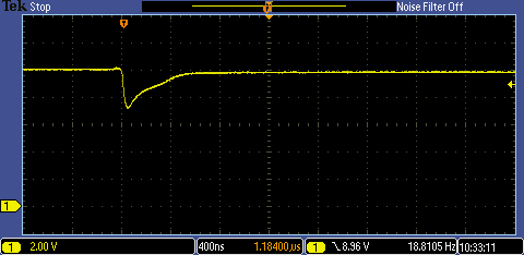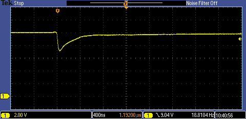 The positive transient when the load is removed peaked at 10.7V and took 1.6us to drop back to 9.3V - much slower after that to get back to 9V, probably because there was no load at all.