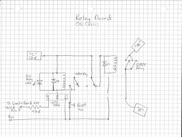 The first schematic is what I am calling the main board. Some of this schematic will actually be on a circuit board and the rest will be components mounted on the chassis of the unit or on the control panel. The boards I am using are solderable breadboards that will work adequately for the level of complexity and precision needed for this project. I am also going to publish my hand drawings of component layout on the boards. While these will be somewhat difficult to read and interpret I want to emphasize the importance of planning before actual construction. These are my attempt at planning. As much as possible these schematics have been prototyped on regular bread board and tested for proof of concept.