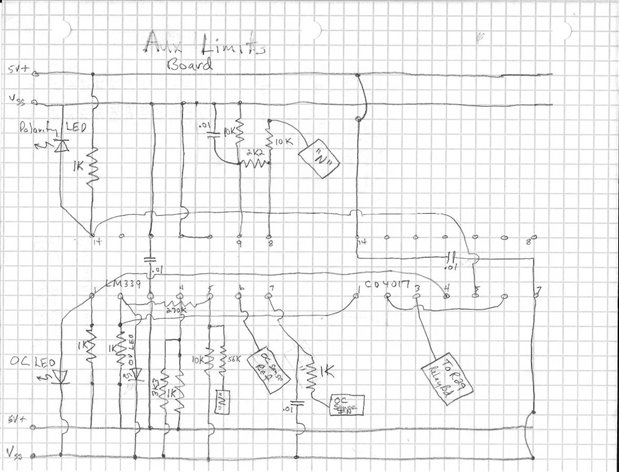 The next schematic that will be covered is for the Limits Board. This is where such fault conditions as Over Voltage, Over Current, and Polarity Reversal are detected and acted upon.