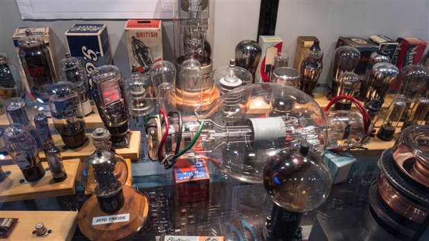 The power supply is a transformer with a 6 volt secondary that is used for the filament of the 6GJ5 tube and a 750 Volt secondary that goes to a full wave bridge rectifier. The bridge diodes are actually silicon types of similar appearance to 1N4007s. The designer of the circuit did not bother to filter the DC output of the bridge leaving it to pulse at 120 Hz. The effect of this is to create an output the has 2.8 MHz pulses with a frequency of 120 Hz.