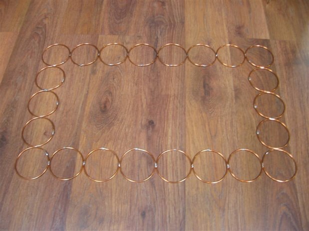 Using an outline of the circuit board on card board I arranged the circles of copper and soldered them together into a frame.