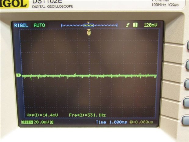 The experiment showed that the isolation of the outputs was good and able to be connected as needed to produce a negative 5 volt rail for the Chinese PS board. I hooked up a load and ran it up to 21 mA which is over double what is expected in normal operation if it were used on the linear board. The ripple on the output looked to be around 150 mV. Here are photos of the test equipment as it monitored the experiment.
