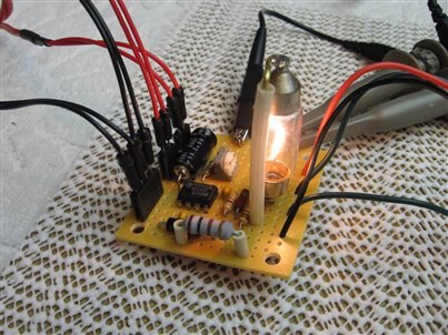 VR-1 allows one to vary the duty cycle of the MOSFET under test from 5% to 95%. While this is fluff, it is fun to turn the trimmer and watch the load bulb brighten and dim. Turning the trimmer fully counter clockwise gives full 95% duty cycle. Here are a couple of pictures of the circuit under test where the components described so far can be seen. You can see the purpose for the four female ground headers and two each female + power headers in the picture.