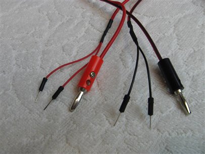 As you can see this is not a complicated project. One of the first things that you may notice however is that I have four ground header pins and two header pins for each of the power supplies V+ inputs. This is a result of the way I make up my power supply cords. For convenience when bread boarding I terminate my cords with a "Y" adapter to two 22 ga. pins. I find this is very convenient for making better contact with the bread board and also allows me to power the rails on both side of the bread board without using extra jumpers. Here is a picture of my power supply cords.