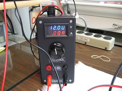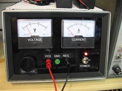 The second power supply (pictured below) is used to provide a Vdd voltage to the MOSFET. In series with this voltage supply I have a 12 volt automotive bulb that draws approximately 500 mA at full brightness. It is the light in the picture above. The test point for the channel two oscilloscope probe is attached to the circuit at the junction between this load bulb and the drain of the MOSFET. This has the effect of giving us an inverted output on the scope. When the PWM signal from the NE555 goes high it turns on the MOSFET which pulls the channel two probe and the load low.