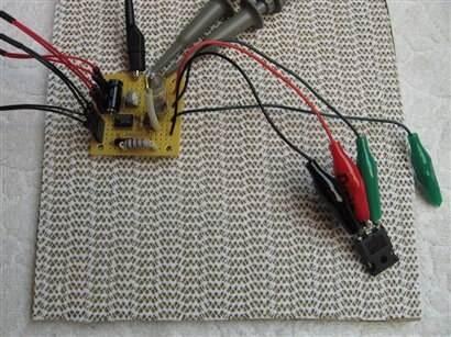 The oscilloscope channel one test probe has to attach to the proper test point on the board and follow the choice of high or low gate output clip so that it can properly monitor the signal and voltage level being delivered to the gate. There are test points provided on the board for each of these gate clips. See the picture above. After the final assembly these test points will be labeled but for now they are left to right ( MOSFET output, Low Gate output, High Gate output, Ground).