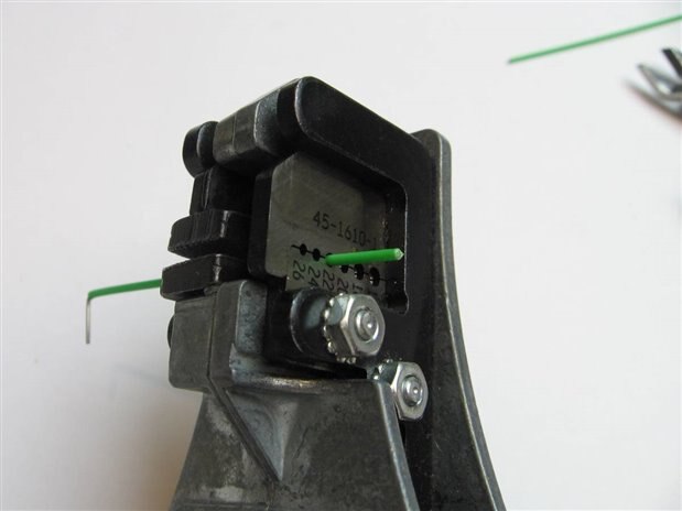 My next challenge was to devise a system to mark my new sized wires. Up to the 10 size we had color to tell us the size but all the larger lengths were being made from the 4 colors used by the 20, 30, 40, and 50 lengths. Color would no longer be relevant. Testing revealed that by using a very sharp permanent marker it was possible to make the following distinguishable marks: " . ", " I ", and " V ". My system would involve a DOT to orientate the beginning of the sequence of marks. Next, spaced to the right would be a " I " for 1 or a " II " for 2. Finally spaced to the right would be the normal Roman Numeral sequence for the numbers for 1 to 9. ( I, II, III, IV, V, VI, VII, VIII, VIIII ). Here is how I marked the 18 wire that was just made and an example of other lengths: