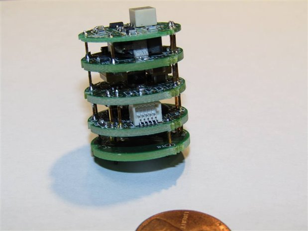 This is a driver circuit from a handheld LED composite cure light. It allows the operator to select a timer setting and drives a high power LED that has it's light output towards the blue end of the spectrum. The unit also controls a cooling fan the size of a dime to help cool the LED. In order to fit the needed components into a body witha diameter on the order of a broom handle they had to stack a set of circuit board disks 2.2 cm in diameter. Pretty cool!
