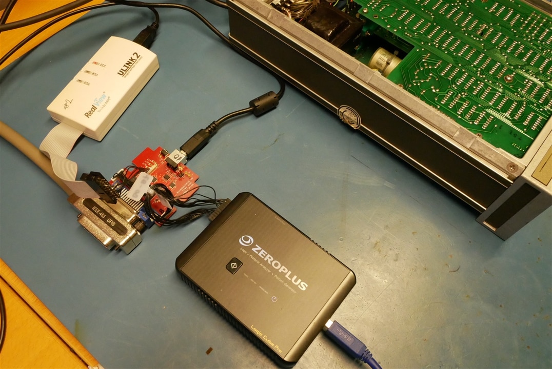 HPIB test rig, showing the approved way of using a home brew GPIB interface - connected to the processor debugger for on the fly improvements. The Zeroplus box is the logic analyser.