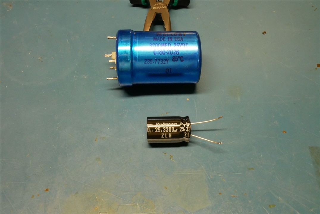It’s quite amazing how much smaller the modern 3300uF 25V cap is compared with the original Mallory 3200uF part. (Not a typo – 3200uF). It isn’t just chips that have got smaller.