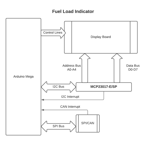 Well, here we are back again, with the Fuel Load Meter. This thing has given me nothing but grief. So I am going to take another whack at it. I still have to make sure that the wiring is correct. and then write the code. The problem I was/am having is the 30-pin connector that goes to the display. This is a Never-Ending Story not to be confused with the movie of the same name (German: Die Unendliche Geschichte). It seems like you take one step forward and two or three backward. This time around I hope to get it right. I need a better plan of attack. Below is the block diagram.