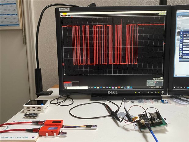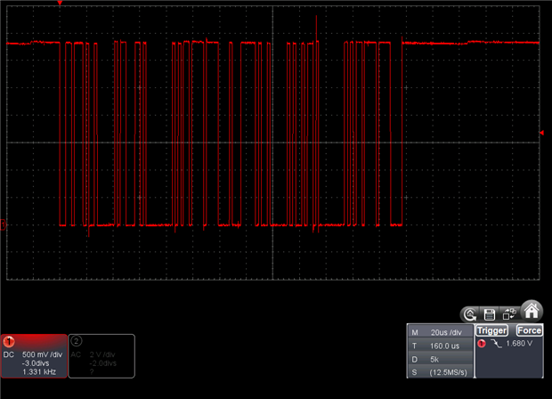 And here's a scope capture of the TX signal that shows accelerometer data being sent between MCUs. The first MCU doesn't have WiFi or BLE, so I'm using the second MCU for communication and will probably also use it to drive a display.