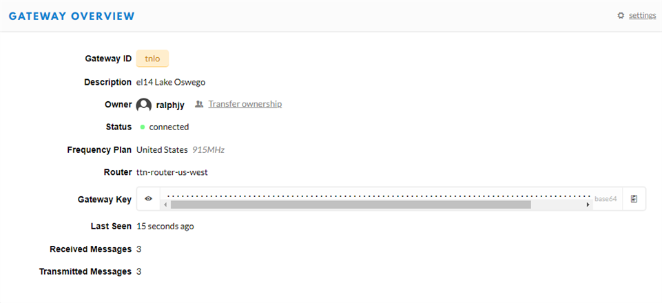 Anyway, got everything configured and the gateway activated. I am running indoors with the antenna that came with the unit, so I'll have to see how much range I can get. I've read some discussions that the range could only be as short as 0.5 km depending on the construction of the house (materials, etc.). That would be fine for me since I have a small lot, but it probably wouldn't provide much value in extending the TTN network to others. We'll have to see if I get any external traffic.