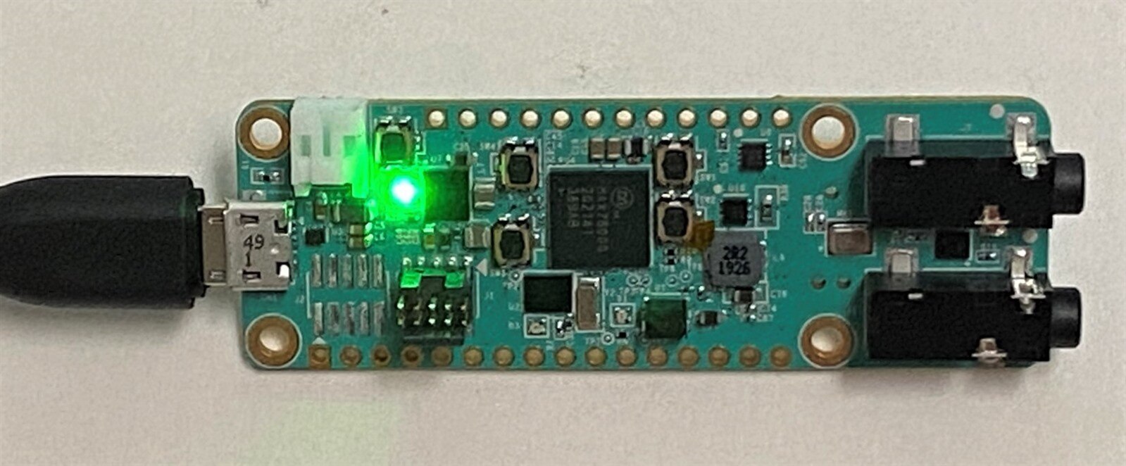 Apply power to the MAX78000FTHR using the USB cable. The pre-programmed 'Audio Keyword Spotting' demo will begin to execute. The RGB LED (D2) will turn on green, indicating that the demo is running. The on-board microphone starts listening for the keyword GO. When the keyword GO is detected, RGB LED (D2) will turn on yellow. In this mode, when one of nine keywords is detected, the RGB LED (D1) starts to blink blue one to nine times based on the number detected by the convolutional neural network. The STOP command exits number keyword detection, and the RGB LED (D2) turns on green again, and RGB LED (D1) turns off.