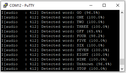 The keyword spotting worked pretty well, except it had a problem with the number four the first time that I said it. It classified ten as unknown because that was not part of its training set. I'm impressed that it did so well considering that it did not train with my voice and the onboard hardware.