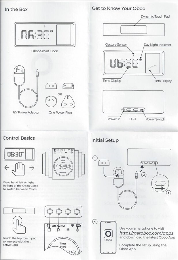 I was very excited to try out my Oboo Smart Clock. I really wanted to demonstrate some of the features to my wife who wondered why I would back a clock on Kickstarter. Unfortunately, the out-of-the-box experience was not very good. The instructions included were minimal, which would have been fine if everything had functioned correctly. They have a browser based app (not a downloadable mobile app as the instructions imply). The app is not well designed and because the scroll boxes don't scroll - you have to guess what acceptable input is based on the ones that you can see. And once you have done the basic setup - if you try to use the reconfigure option to fix a setting, it appears to cause the WiFi to disconnect (or maybe it just suppresses the icon). Initially I had a problem with the battery indicator not working and I also could not change the displayed units from Metric to English. I managed to find an instruction manual using Google and did a firmware update. That fixed the problem with changing the units and it also added a calendar card (it initially had a timer card, a music card and a weather card). There is no traffic card yet. I assume that will be in an update.