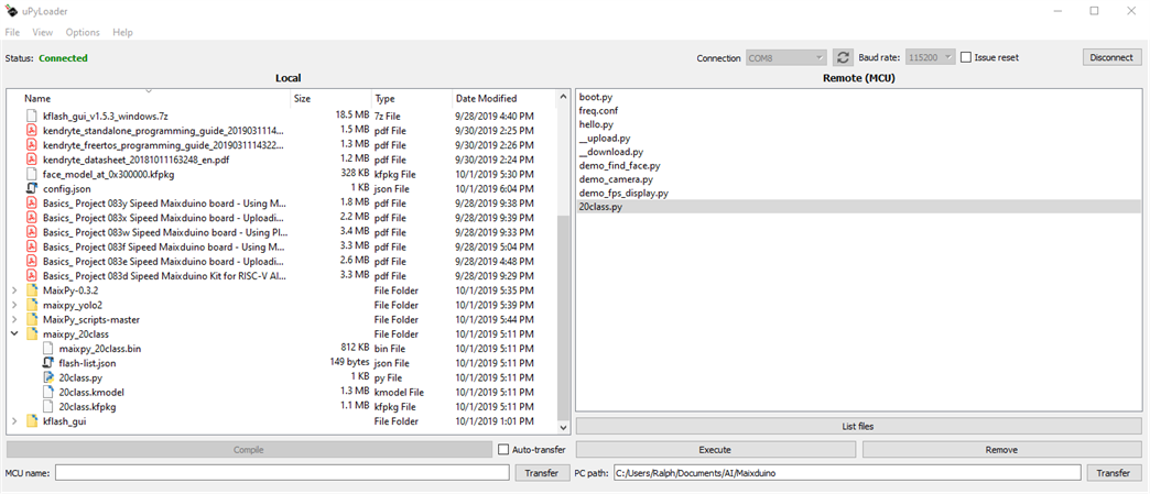 The next utility required was the uPyLoader which enables file transfers between my Windows file system (on the left) and the Maixduino file system (on the right).  This tool also allows for remotely executing Python programs.  And it has a terminal capability for command line execution.