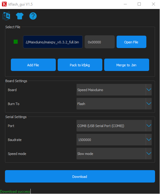Below is the kflash GUI.  The MaixPy binary file is loaded at address 0x0000.  The other binaries are loaded at an offset addresses beyond the end of the MaixPy binary.  Here I am loading the "full" version of the MaixPy binary which allows for running remotely from an IDE.  Unfortunately, I discovered that the size of this binary would not allow me to run the neural network examples.  I ended up loading the "minimum" version and not using the IDE.