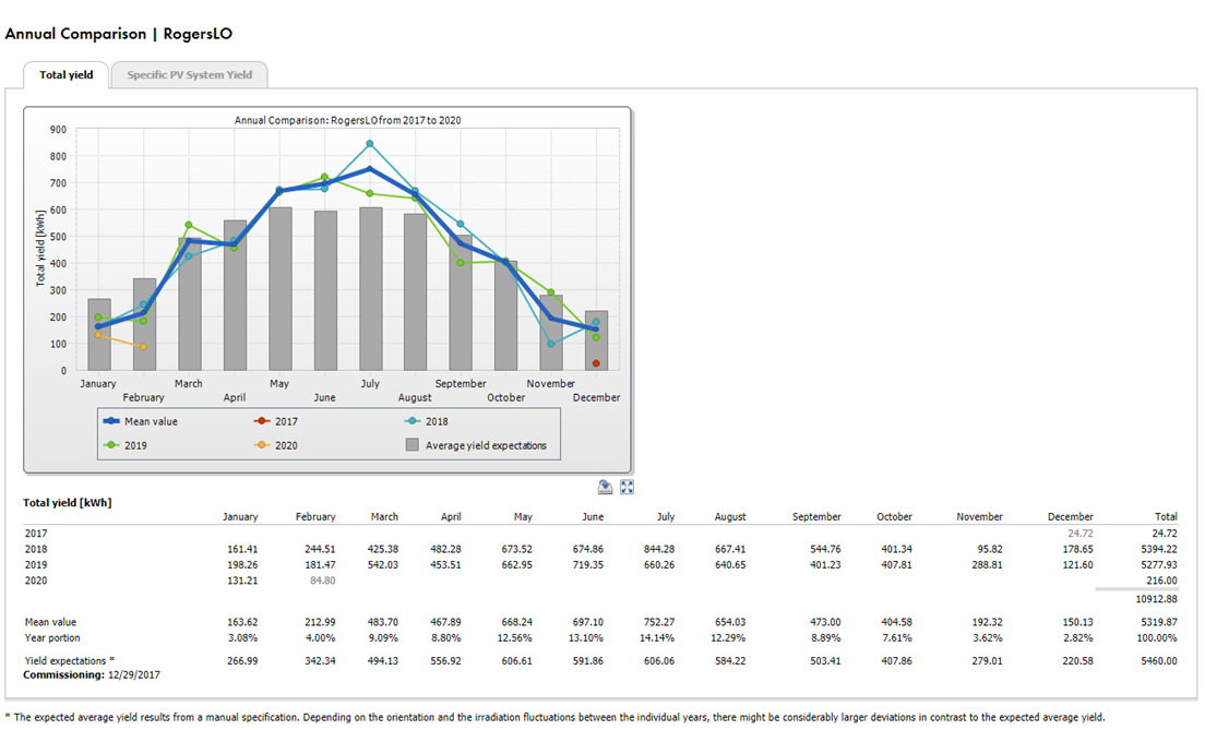 Here's a view of how we've done over the life of the system versus my adjusted yield estimate (5460 kWr/year):