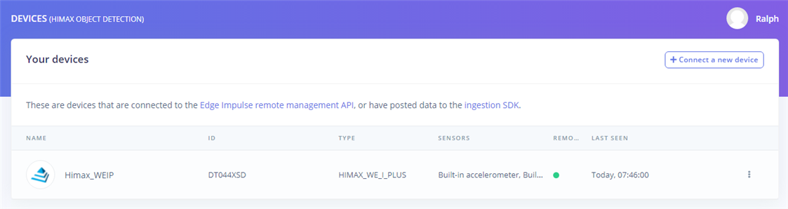 The device will now be connected to the project in my edge impulse dashboard.
