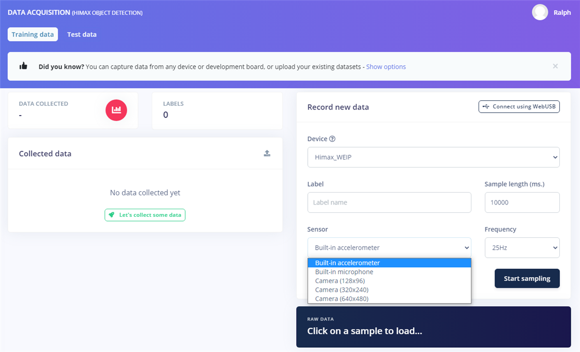 I'll select a sample of the Camera at 640x480 resolution. It will give me a live preview in the Camera feed window. Then I just need to label the data (Ralph) and hit the Start sampling button.