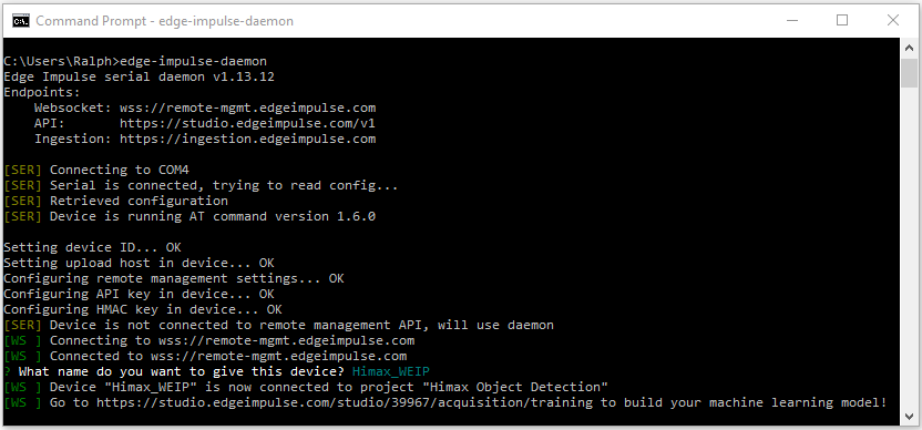 Now at the Command prompt you can start the edge-impulse-daemon which will connect the device to your project. The first time you start the daemon, it will ask for your edge impulse credentials (name,pw) and which project to connect the device to. In this case, I've connected previously but not named the device - so it just asks for the device name. If I wanted to connect to a different project I could have started the daemon with the --clean option.
