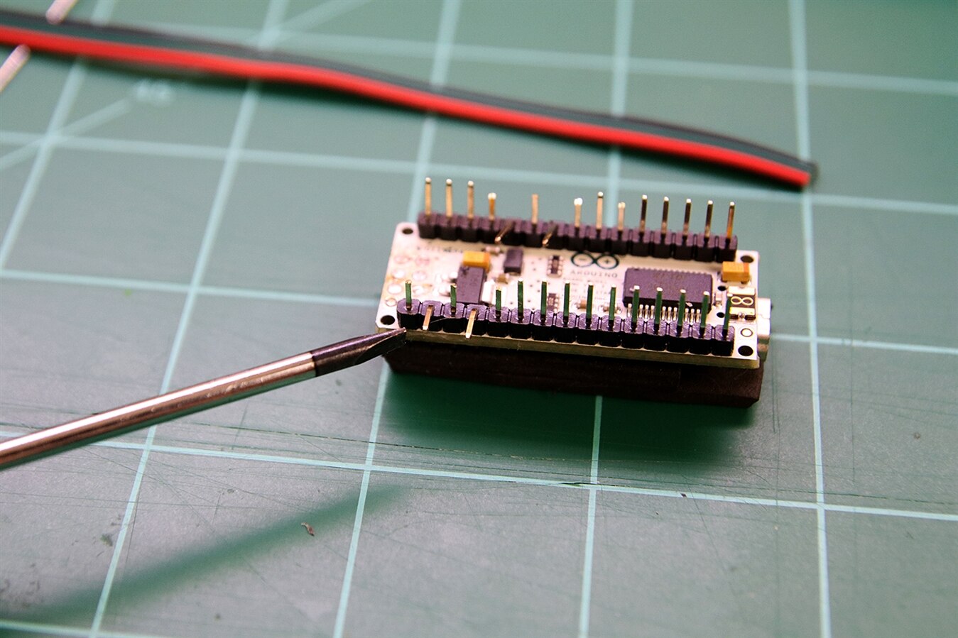 Before we solder our wires to the Arduino Nano, cut a small passageway into the top of the foam. This will allow us to pass the Neopixel’s wiring under the Arduino when installing the electronics.