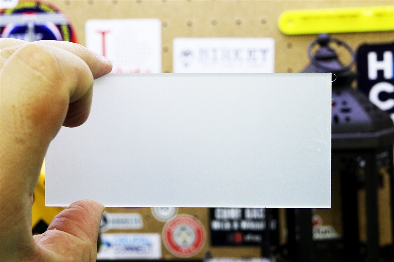 With the glass panes dry, I set them aside and started work on the electronics. Here you can see how opaque the frosting spray made the glass. The frosting spray works well, but we will still have to diffuse the light even more and we will discuss that more later. When setting the panes aside, do not stack them, or place anything on top of them as the frosting spray is pretty fragile and will scratch very easily.