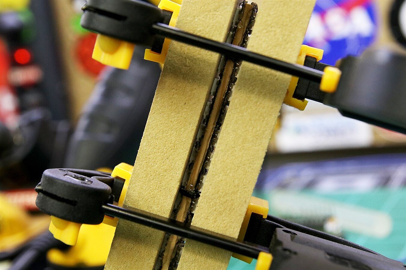 To ensure that the strips stayed oriented on the popsicle stick, I used a pair of small zip ties to secure them to the stick. Then I placed the sandwich between two scrap pieces of wood, and used small clamps to apply gentle pressure until the glue cured about an hour later.