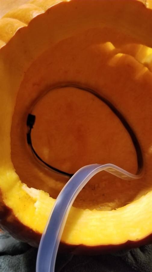 For this project, I carved a pumpkin using a UFO stencil and wrapped it in a 16.4ft WS2812B, individually addressable, LED strip controlled by an Arduino UNO and powered by a 5V 10A power supply. A 3rd of the LED strip is inside the pumpkin, another 3rd is wrapped around the stem, and the last is wrapped around the outside. The strip is fed through the top lid with a rectangular hole. This 16.4ft strip has a total of 150 Individually addressable LEDs.I created my own lighting sequences and put them one after the other for a UFO-like show.