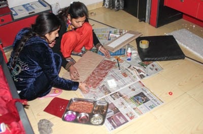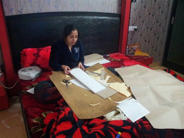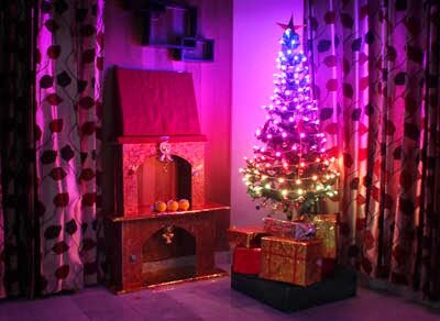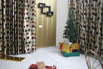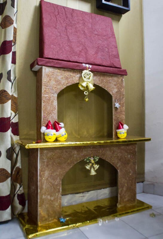 The wall seems pretty dull and gloomy and the whole thing wont work with just lights. We need a better setting so I went out to look for something to make things better. I found PVC sheets that can be used for the wall and I could fit them pretty easily. No paint or anything necessary hence me and my wife took a day out to set them up. We also bought a tree and I order a wooden wall mounting rack which I setup on the wall. My better half decided to demonstrate her skills with Styrofoam and cardboard to fabricate a fireplace.
