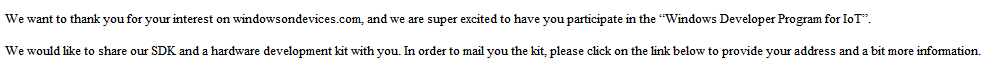 While they don't explicitly state the "dev kit" they will be issuing they picture the Intel Galileo board and say "Development hardware like the Intel Galileo board..." might suggest you will get the Galileo which is software and pin compatible with the Arduino Uno R3 but will run a headless version of windows (Atleast it can't BSOD if there is no monitor).