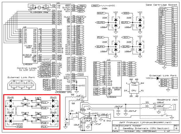 It seems like the old Gameboy Classic uses a more complex circuit when it comes to button inputs, as you can see here: