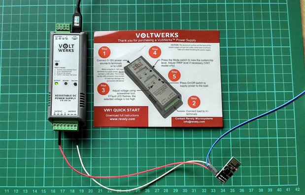 The photo shows the VoltWerks unit powering up my recent acquisition, an ESP8266 module (tiny low-cost serial port Wi-Fi module).