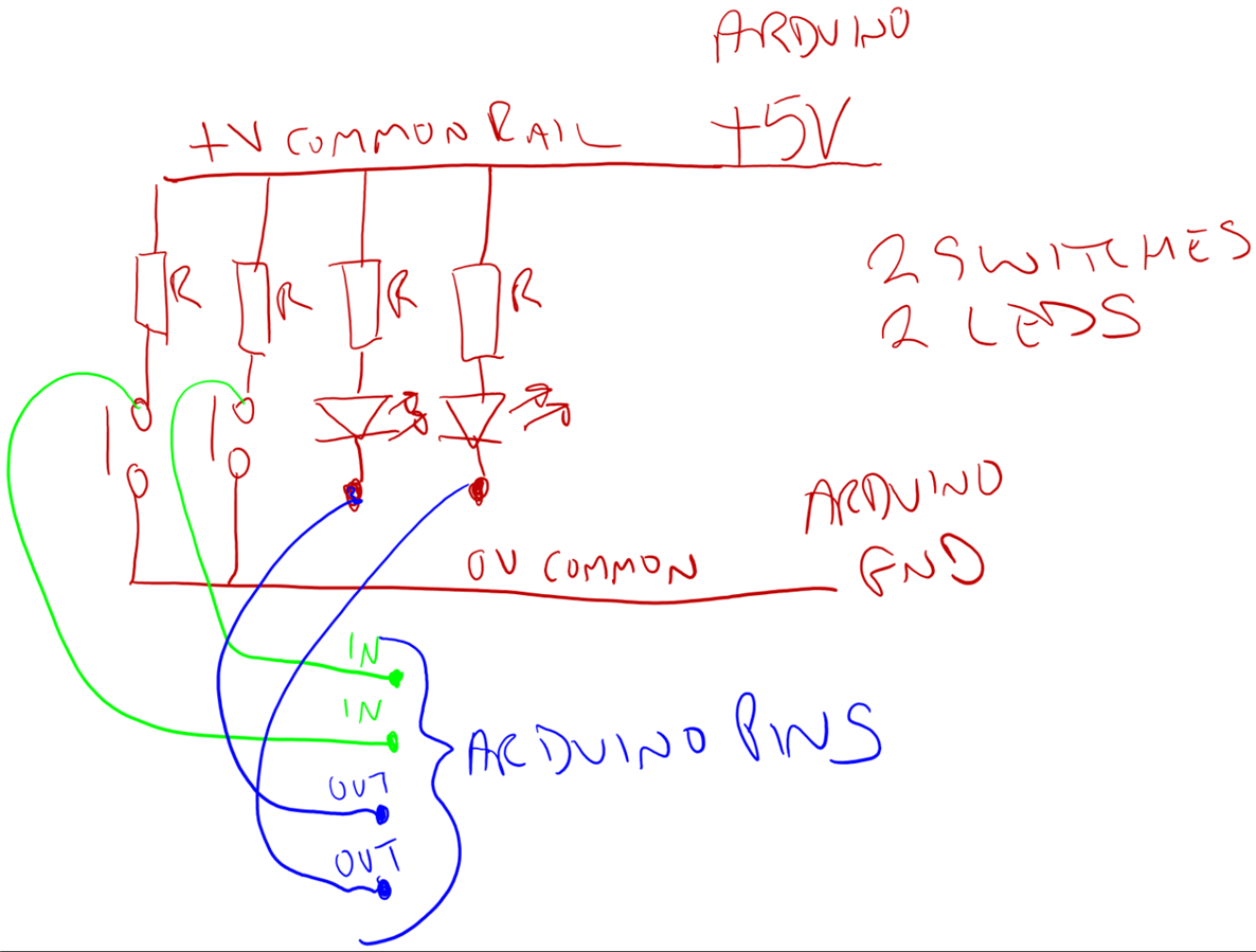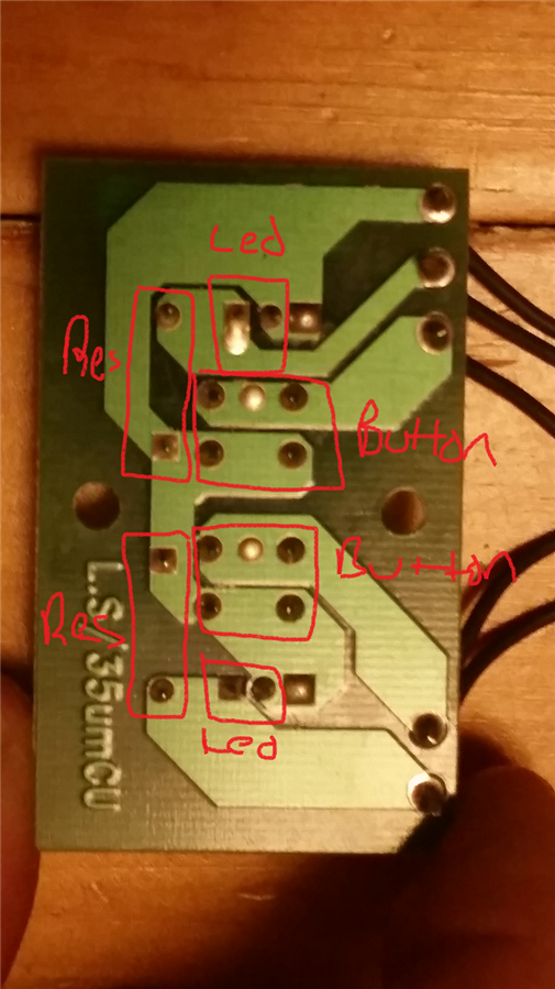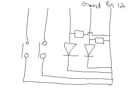 Hi, so I have little pcb with 2 leds and 2 switches on it.  A common wire goes to one side of all of 4 items and a single wire goes to other side of each item, for a total of 5 wires.  In addition, there is what looks like a resistor connecting both sides of the leds.  My issue is that to get an led to light up, I have to connect the common wire to the signal of pin 12, for example, and the individual wire for that led to ground.