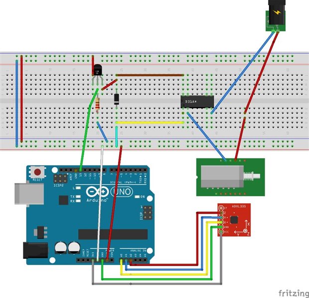 it is my opinion that this circuit - that seems at least well done and set - maybe perfect or crap. It depends on two things: the correct connections between the accelerometer and the other components to the Arduino pins but - first of all - how do you manage with a script the signals, pins and connections - So untile we can't see a line of your code we can't imagine what you are doing with this stuff.