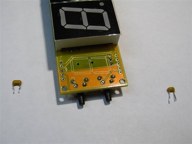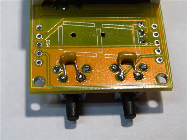 The structure of the support brackets of the switches themselves prohibited mounting on the switch side of the board. Fortunately the Display segments sit up on legs that provide 4 or 5 mm of clearance underneath. The small ceramic 10 nF fit nicely under the display and the fronts of the displays are flush with each other. Thanks again for your great post and I see that the in depth discussion of bounce it continuing over there. Awesome!